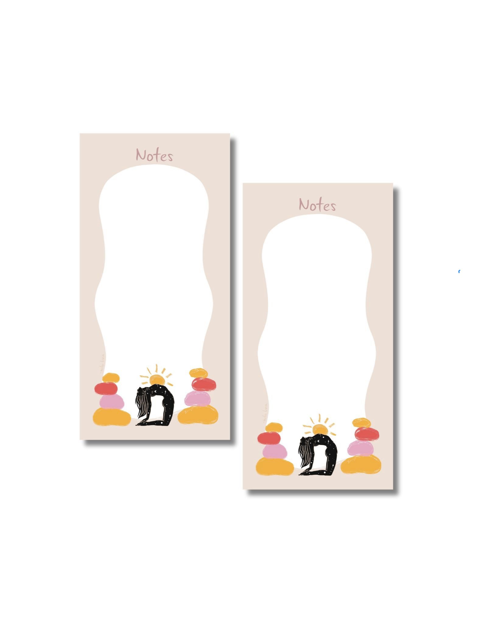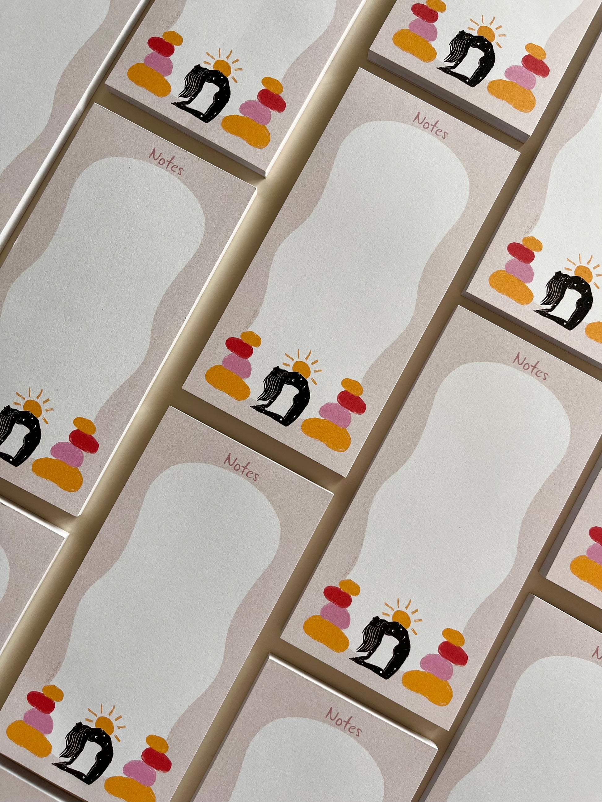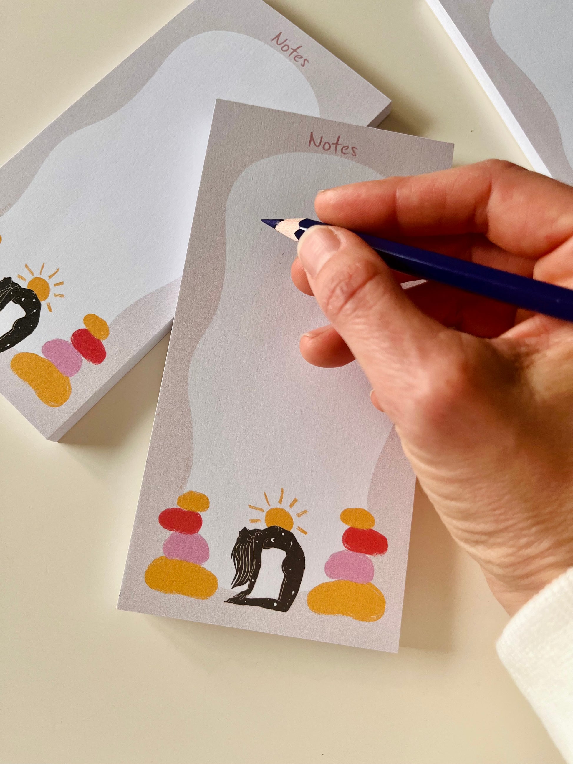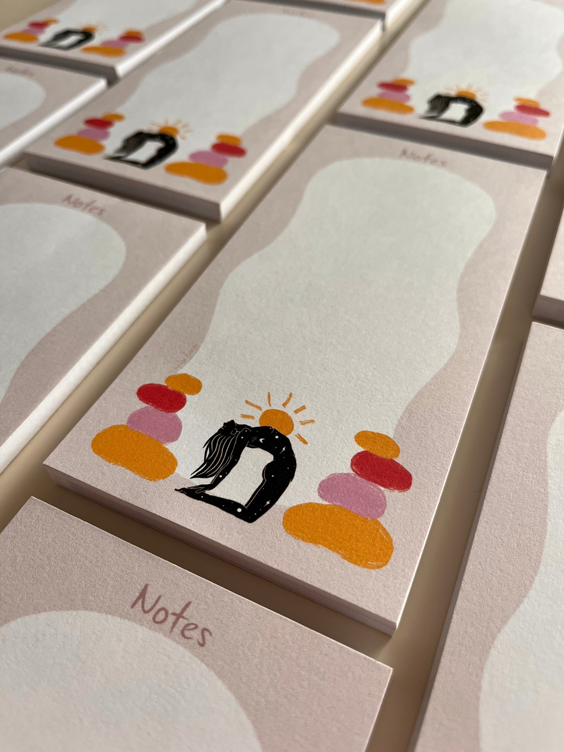 Autorský papírový bloček s odtrhávacími listy ve formátu 80 x 160 mm, který ti pomůže zachytit nápady, myšlenky i malé každodenní připomínky. Minimalistický design se zářící ženou a kameny - symbolem rovnováhy, klidu a vnitřní síly.