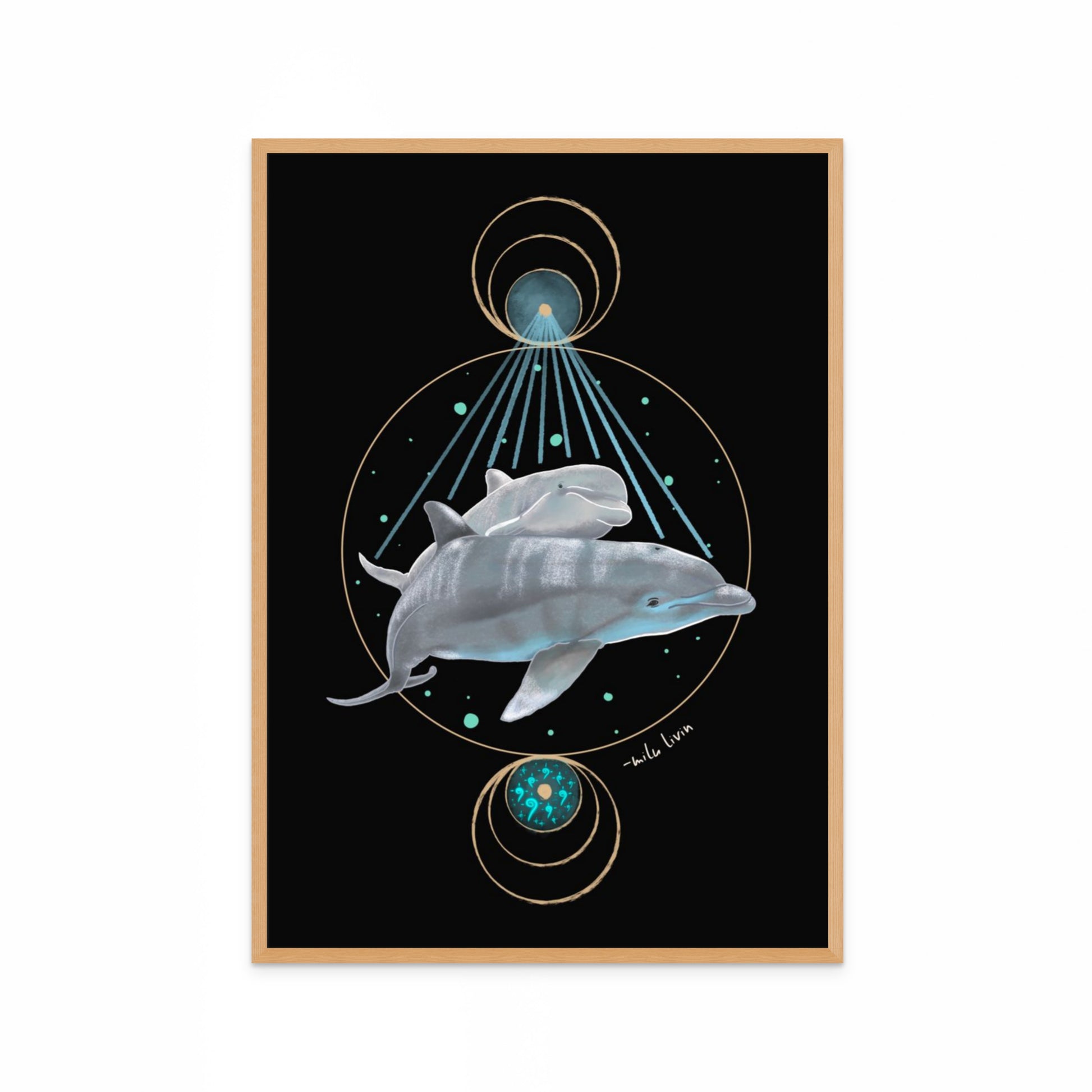 Jemná ilustrace dvou delfínů. Poselství o světle, laskavosti a propojení.