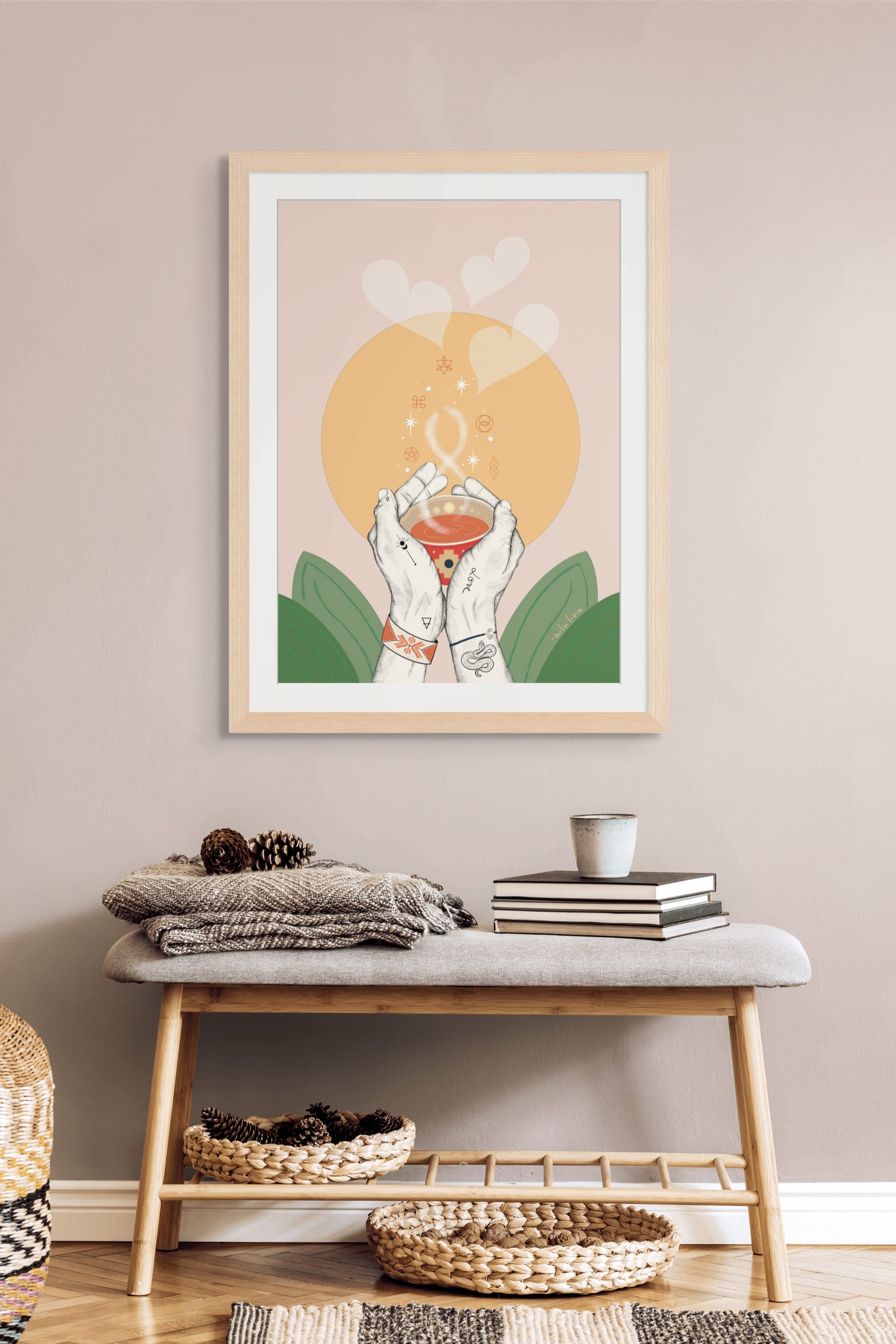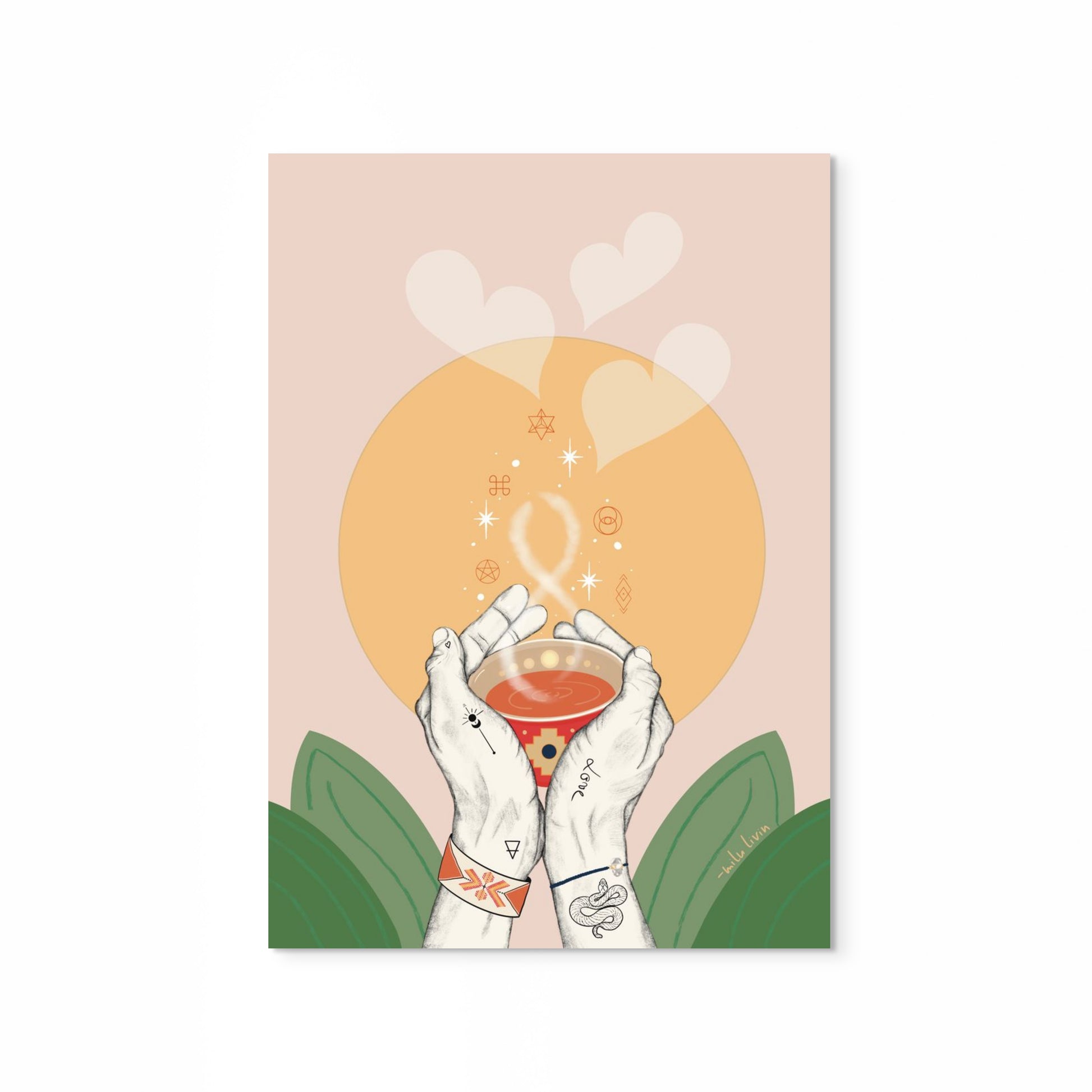 Hladivá ilustrace plná symbolů, která rozjasní prostor, kde se tvoří srdcem - ať už je to oltář, koutek pro rituály nebo místo odpočinku.