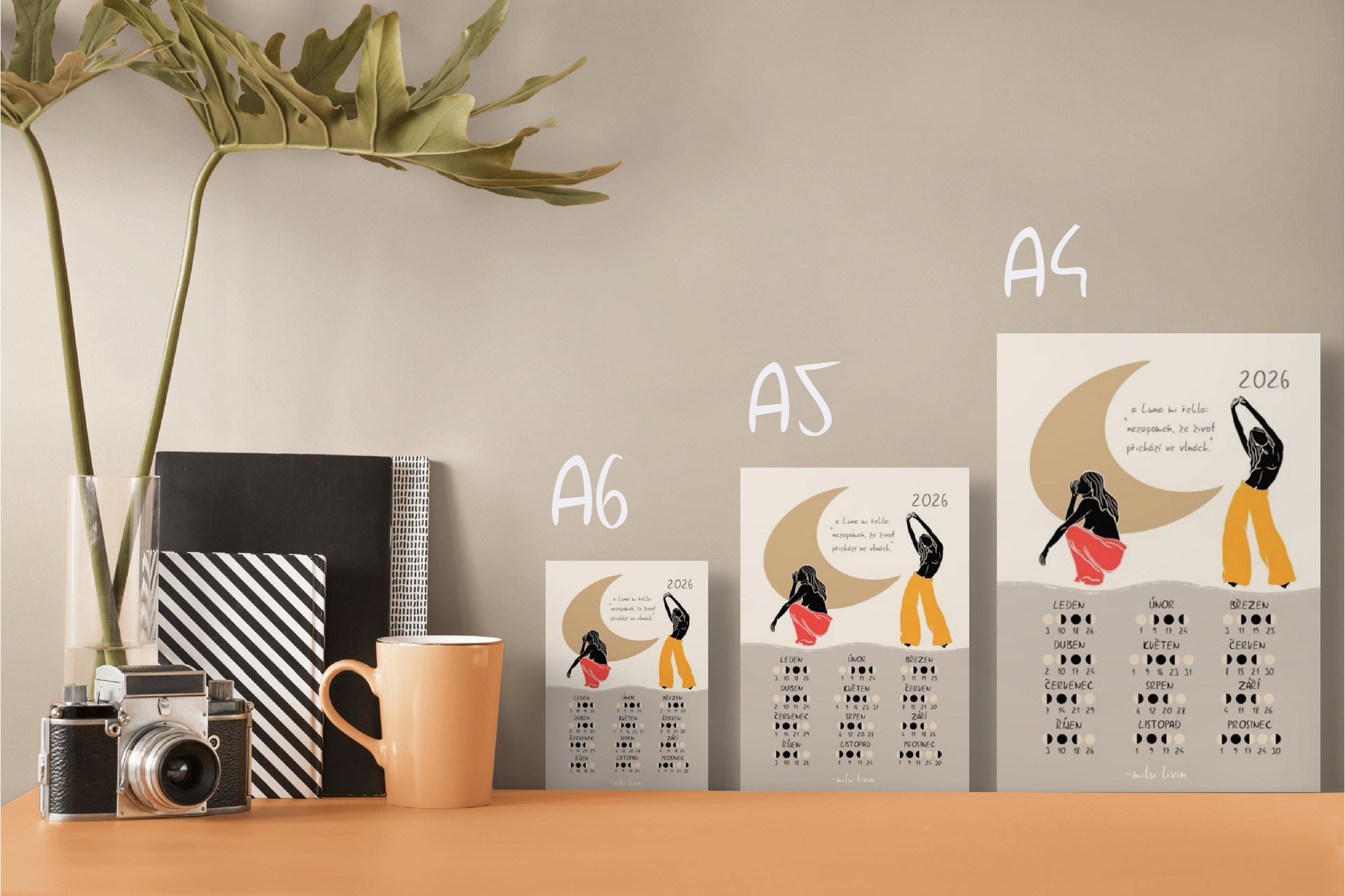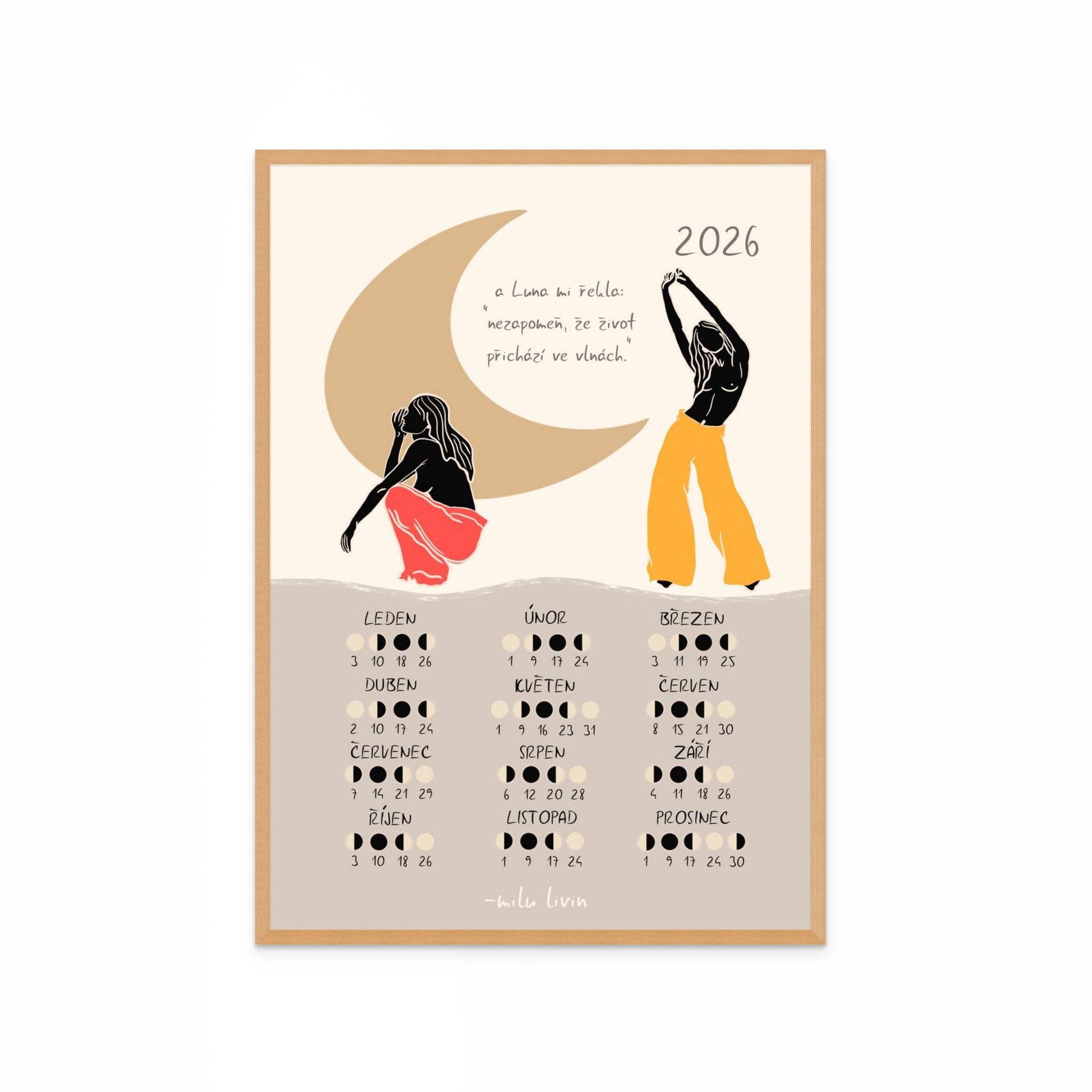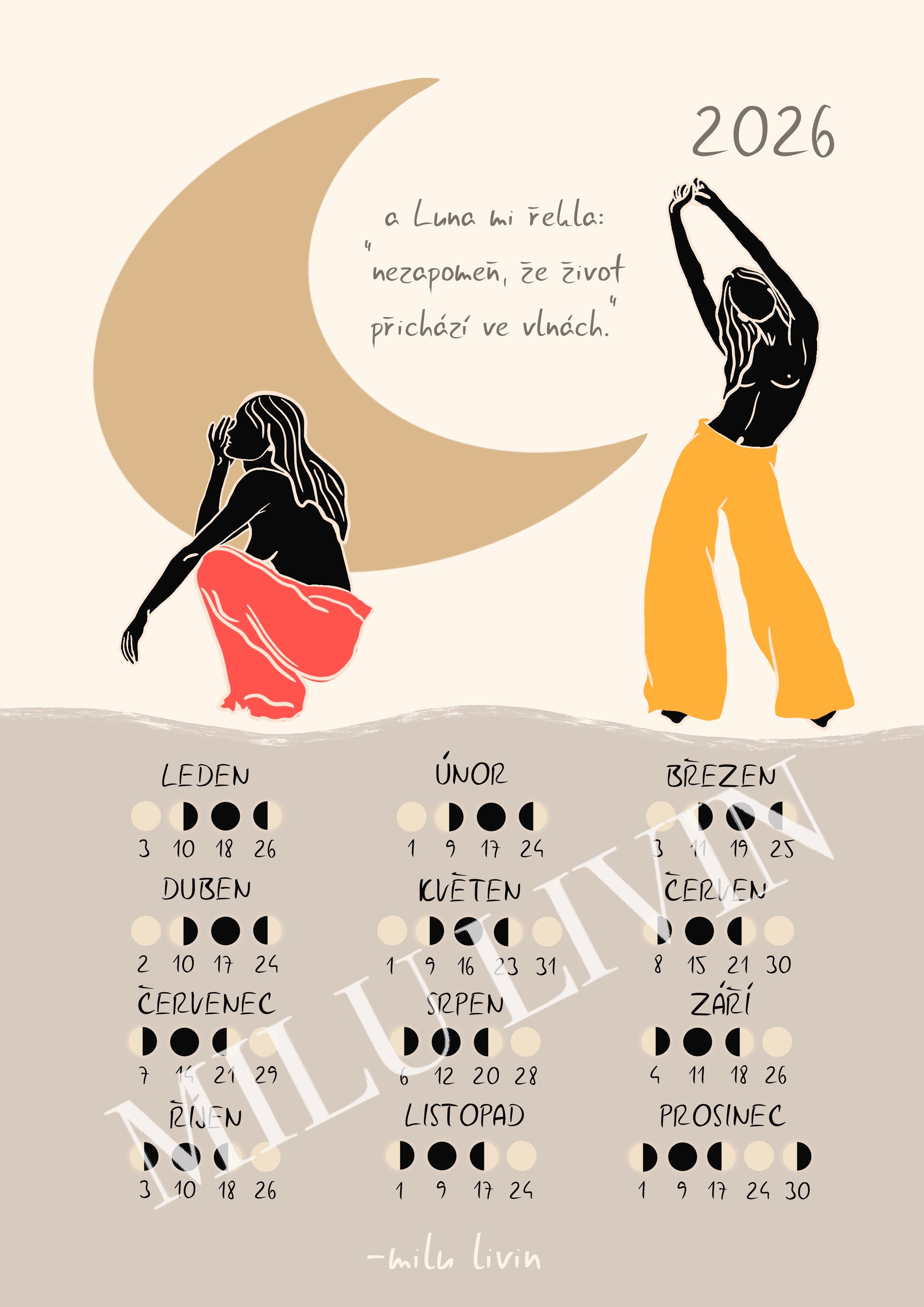 Světlé tóny, měsíční symbolika a pohyb ženských postav vytvářejí pocit lehkosti, důvěry a plynutí. Kalendář není jen o datech – je o naladění, o schopnosti zpomalit, vnímat proměny a být k sobě laskavá i ve chvílích, kdy energie kolísá.