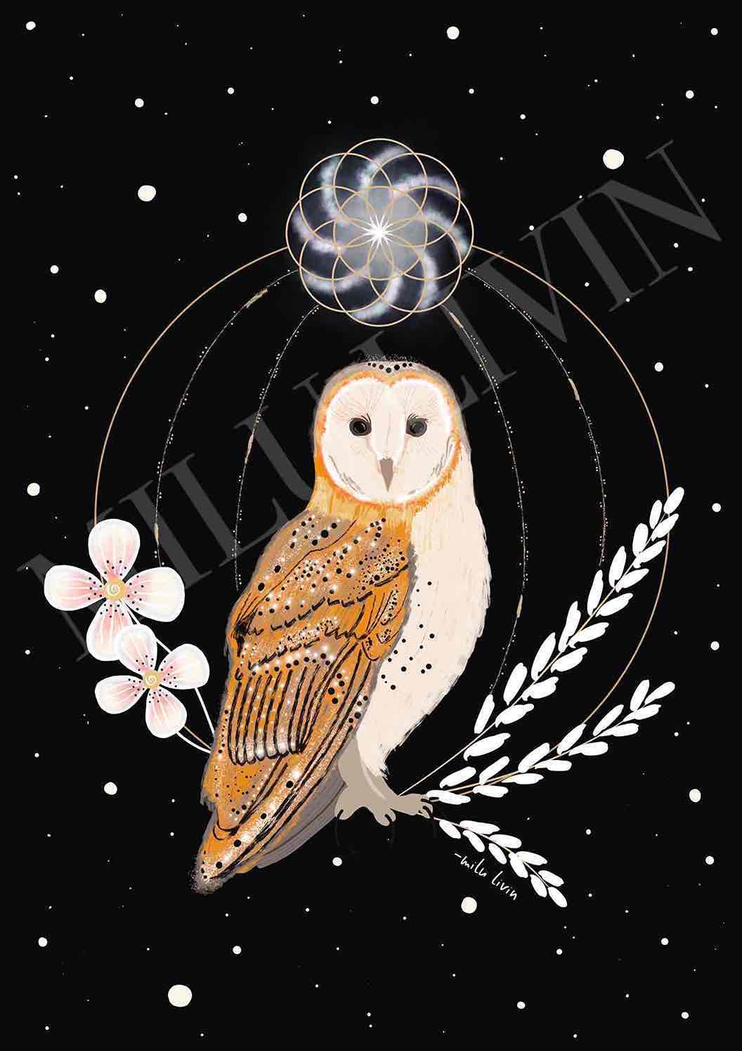 Jemná ilustrace sovy pod hvězdnou oblohou. Tiché připomenutí moudrosti, vnímavosti a hlubšího pohledu.
