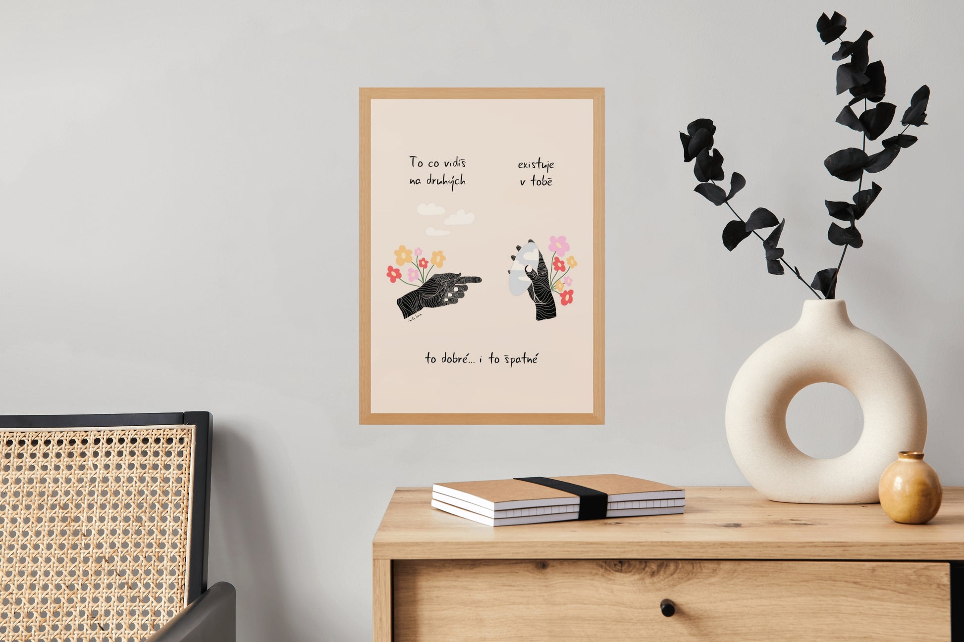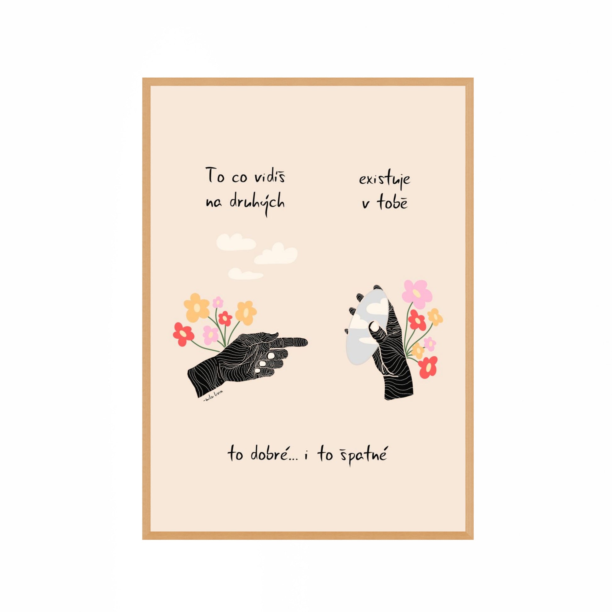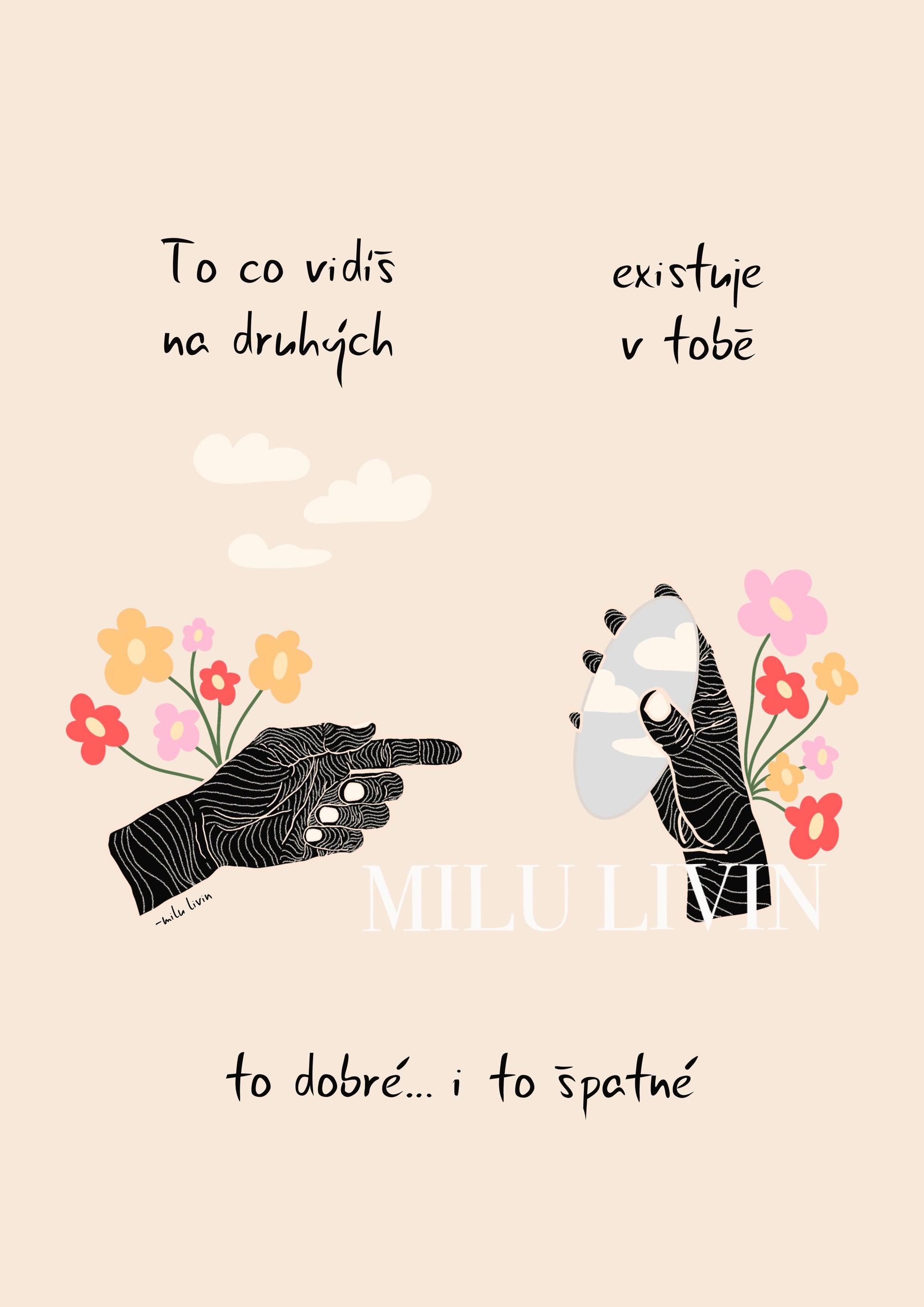 Jemná ilustrace se symbolikou dvou rukou a květin. Připomínka toho, že vztahy s druhými jsou často zrcadlem našeho vlastního vnitřního světa.