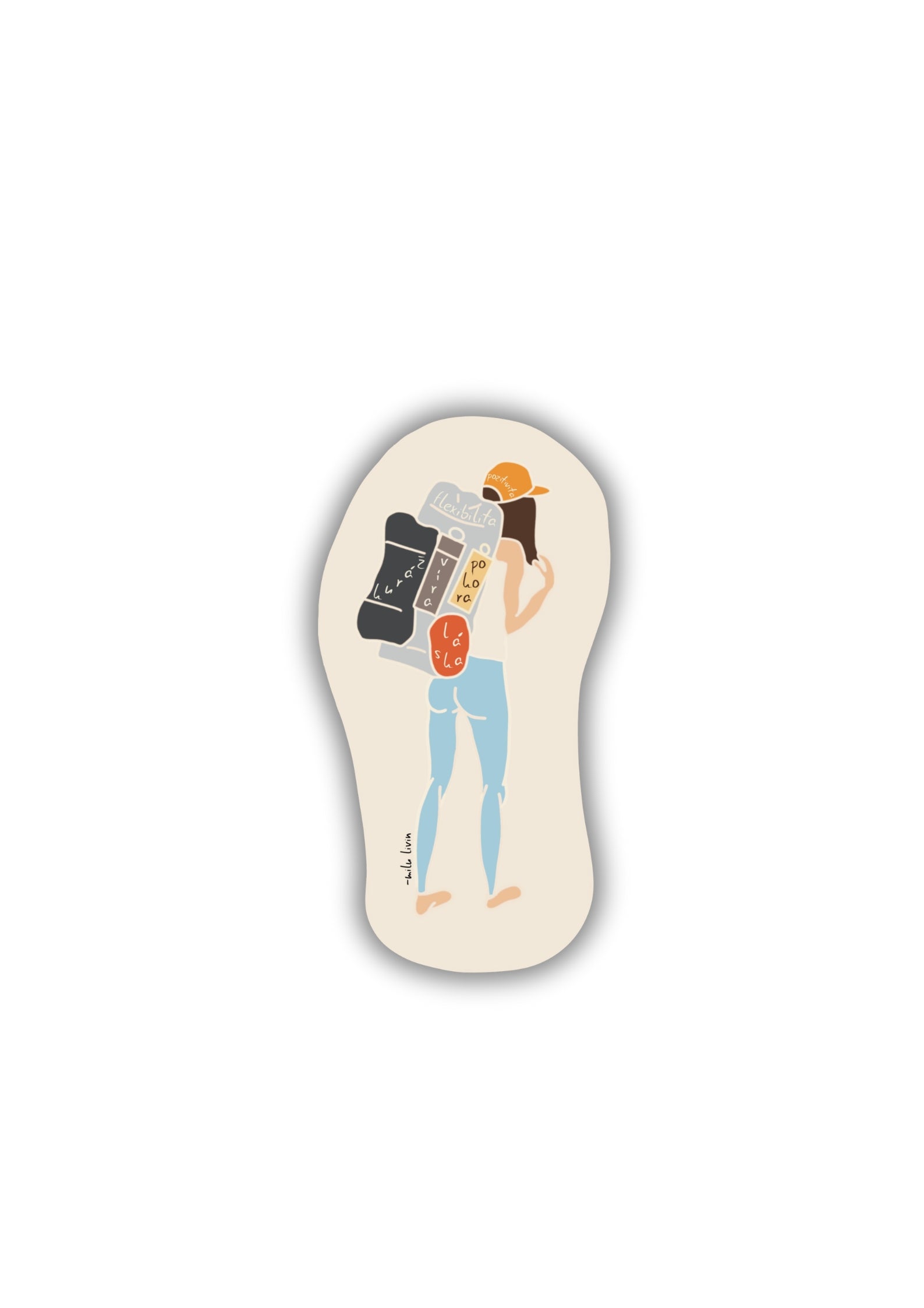 Malá motivační samolepka s ilustrovanou postavou na cestě - vybavená odvahou, vírou a láskou. Jemný vizuální seznam všeho, co s sebou potřebuješ na každou vnější i vnitřní výpravu: čepice plná pozitivity, spacák z odvahy, láhev víry, krabička pokory a hlavně...hodně lásky.