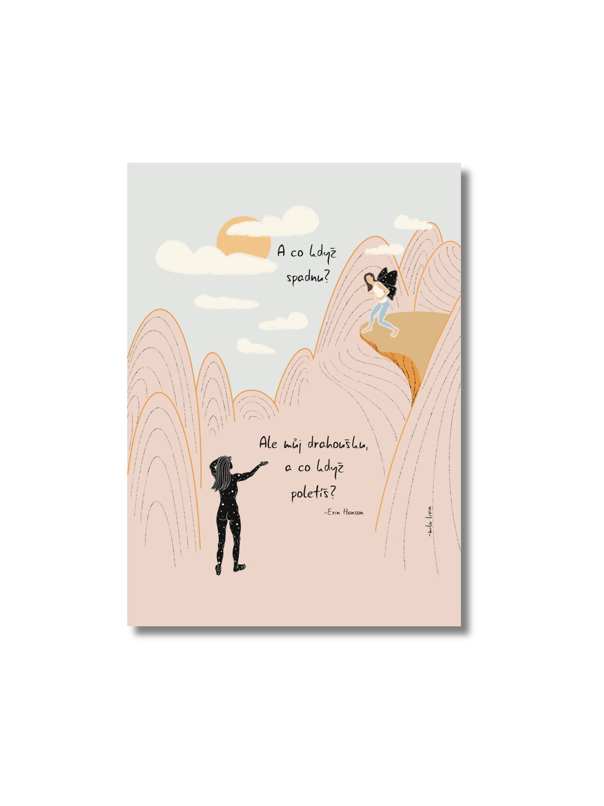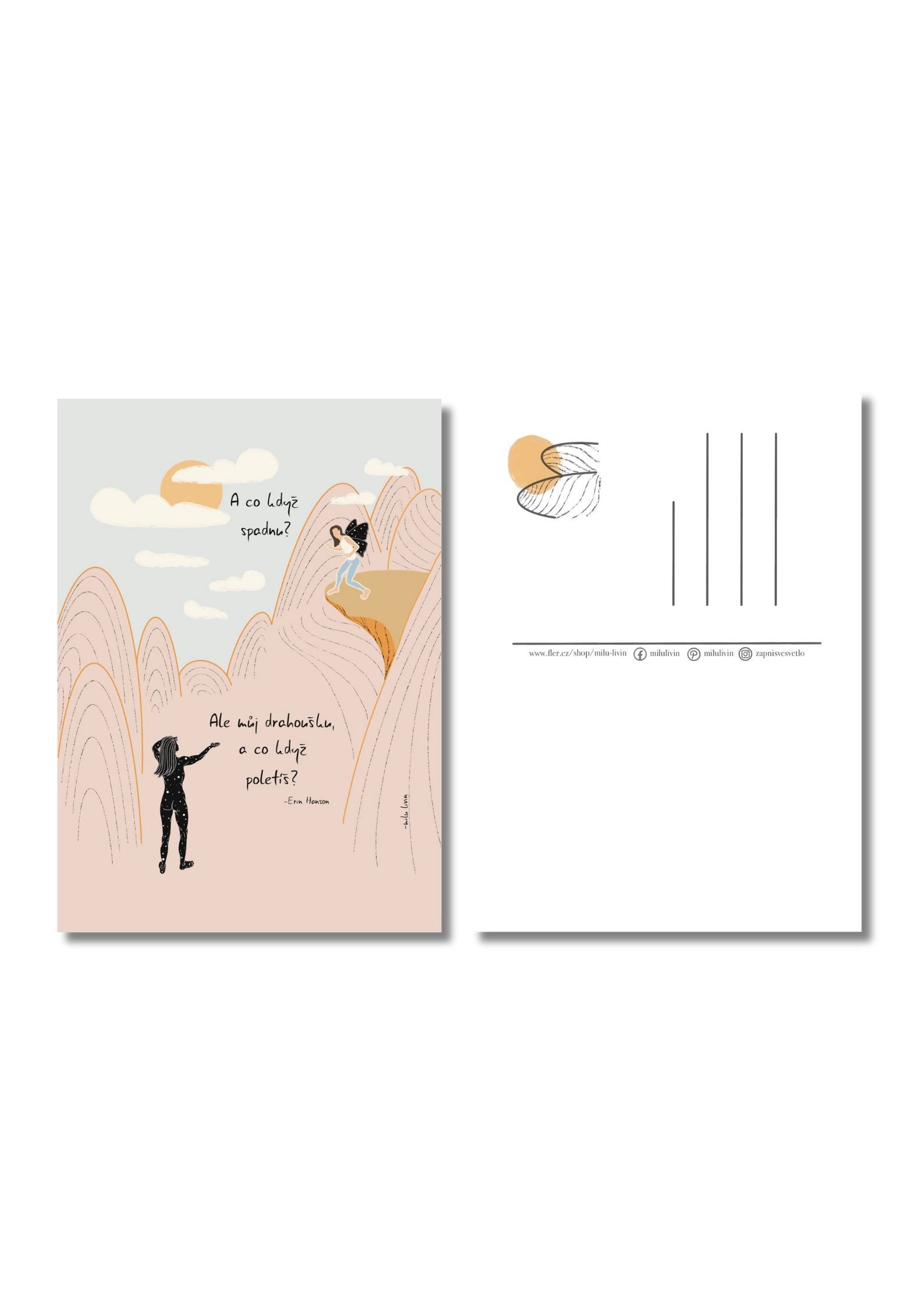 Pohlednice s autorskou ilustrací a poselstvím o odvaze a víře. Ideální povzbuzení do deníku, pro přátele, kteří před sebou mají důležitý krok, nebo jen tak - jako připomínka, že svá křídla už máš.