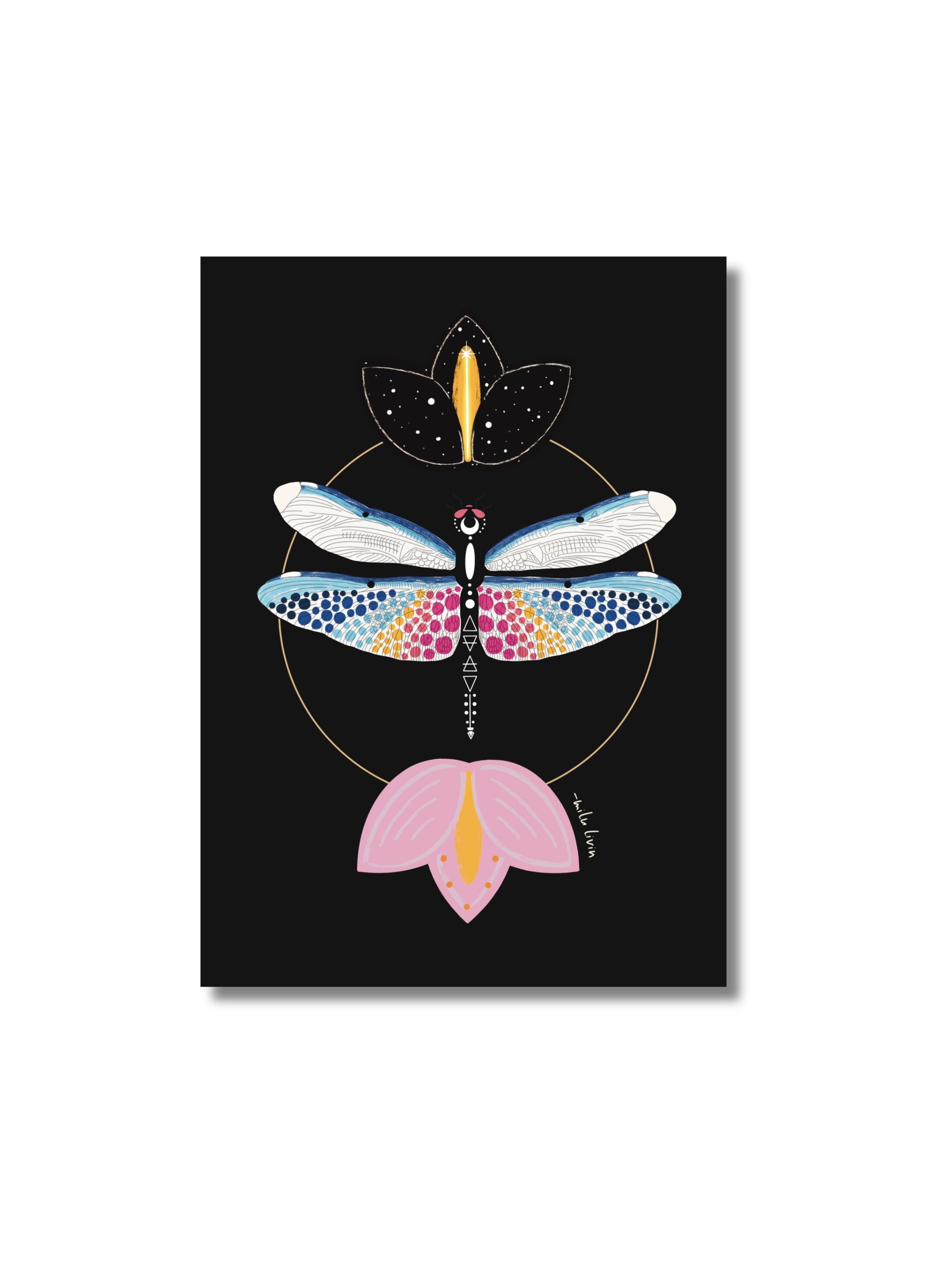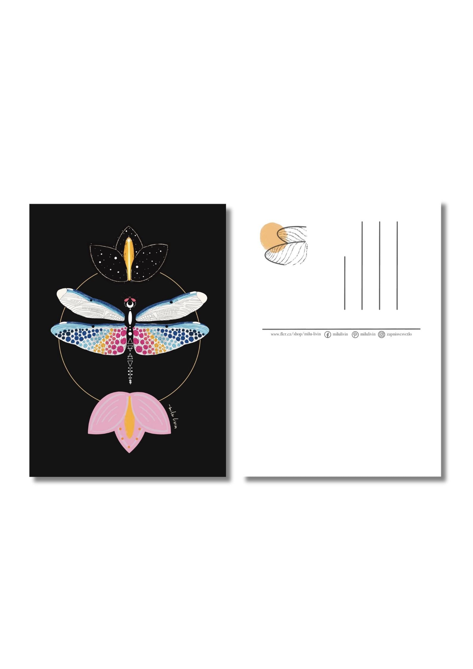 Pohlednice s autorskou ilustrací vážky - symbolu lehkosti, transformace a vnitřní síly.