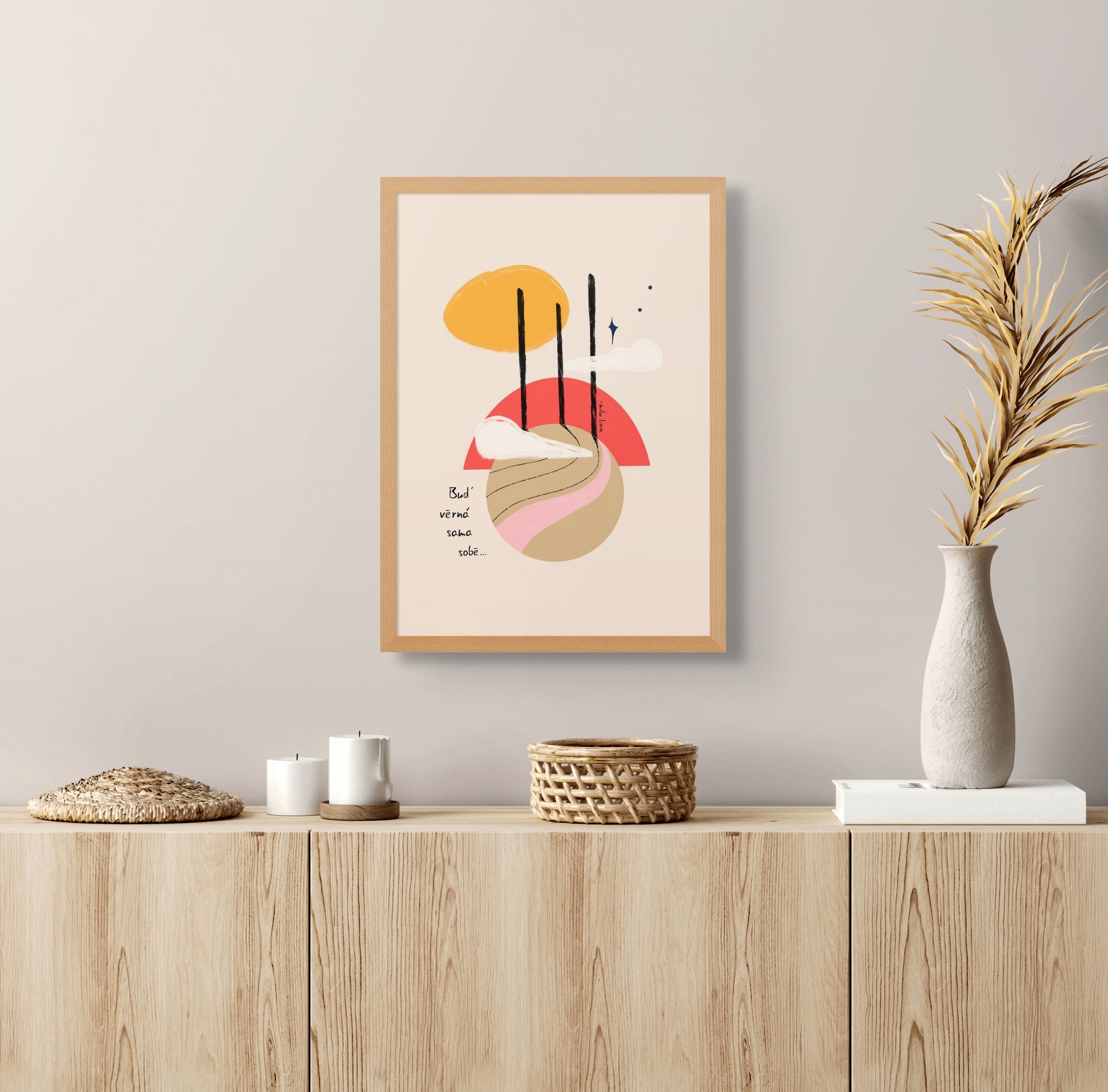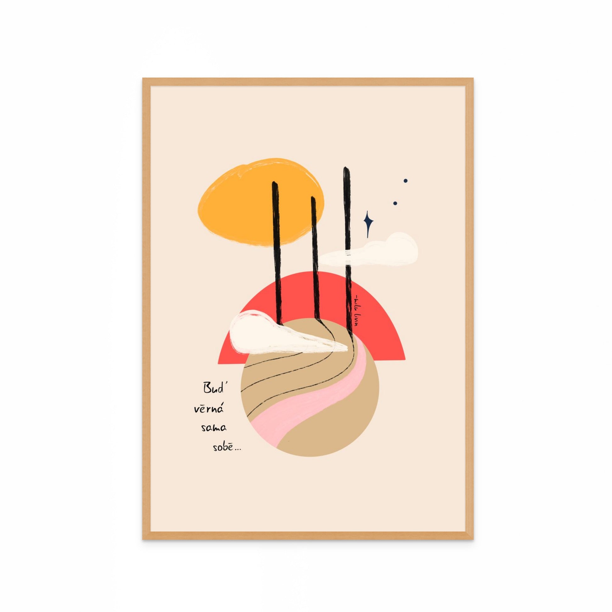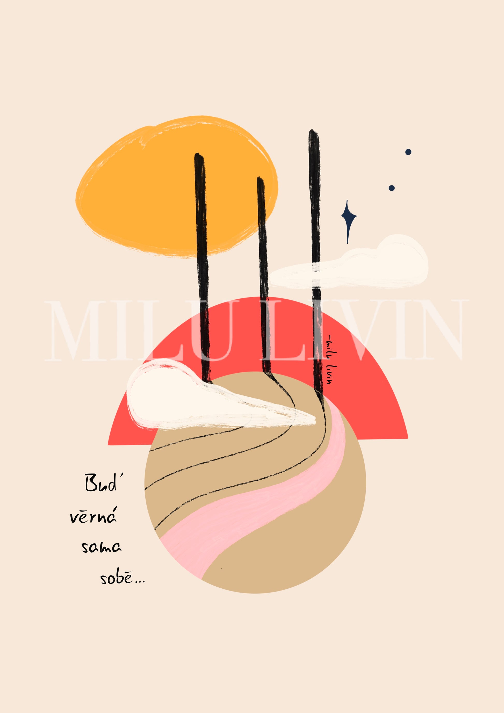 Tichá, ale silná připomínka vnitřní pravdy. Tato abstraktní ilustrace spojuje ženský princip, cestu duše a symboliku slunce, měsíce a hvězd.