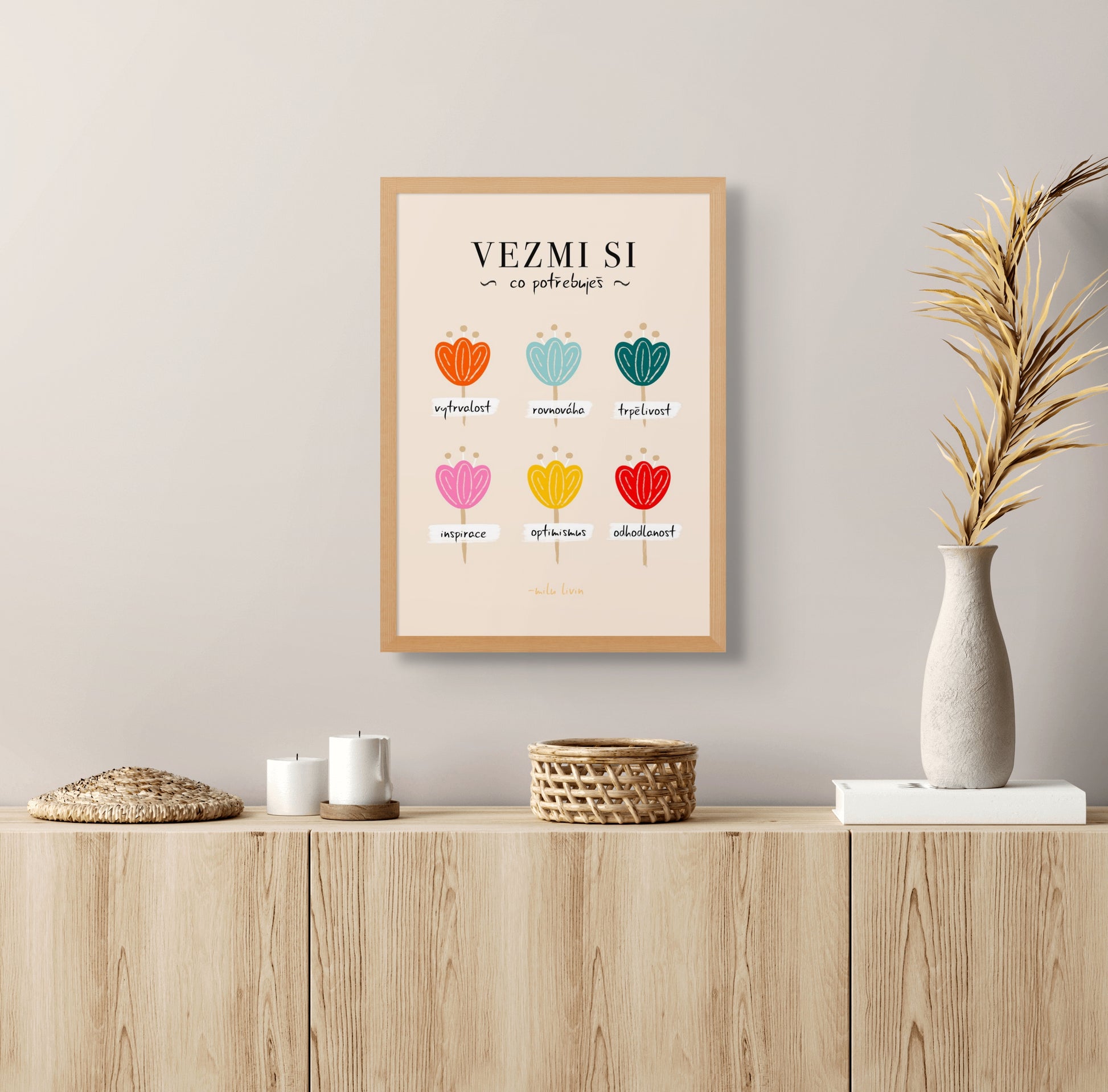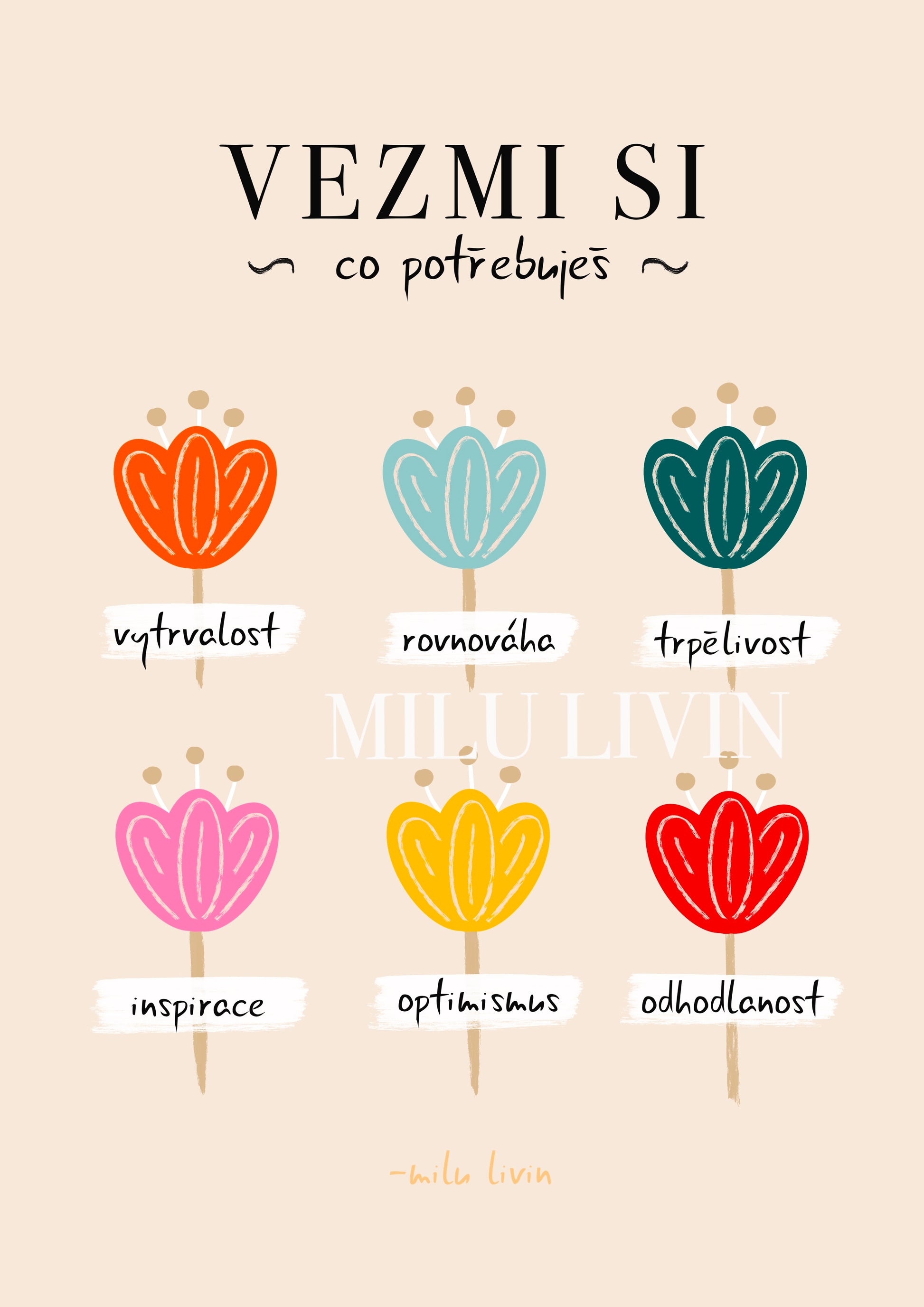 Autorský tisk s hravou řádkou tulipánů, které nesou poselství - vytrvalost, rovnováhu, trpělivost, inspiraci, optimismus a odhodlání.